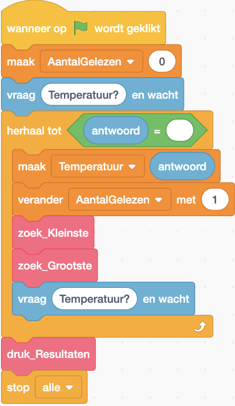 Het aantal benodigde variabelen is beperkt. Het getal dat we aan het bekijken zijn moet zich natuurlijk in een variabele bevinden. We kunnen deze geheugenplaats aanduiden met de naam Temperatuur. De laagste gevonden temperatuur bewaren we dan in de variabele LaagsteTemperatuur en de hoogste temperatuur in de variabele HoogsteTemperatuur. Het eerste element in de reeks is duidelijk een uitzondering. Dit element kan namelijk nog niet worden vergeleken met de hoogste en kleinste gevonden waarde. Het is dus aan te bevelen om het aantal bekeken elementen bij te houden. Deze variabele kunnen we bijvoorbeeld aanduiden met de naam AantalGelezen.