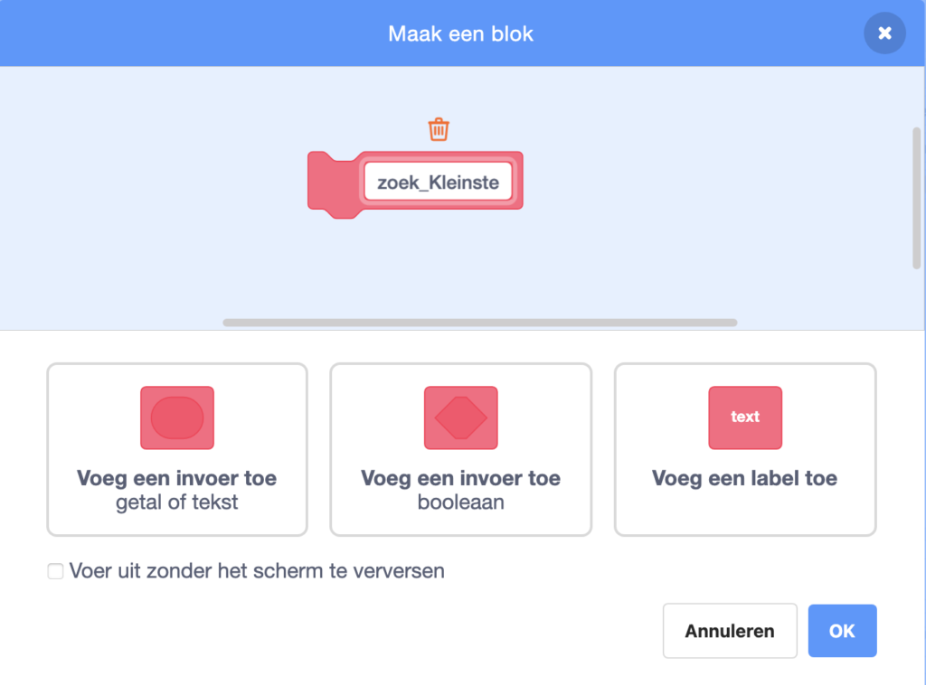 Een procedure (blok) krijgt steeds een naam. De naam van een blok is willekeurig. In ons voorbeeld hebben we gekozen voor zoek_Kleinste, zoek_Grootste en druk_Resultaten. Het is natuurlijk aan te bevelen om een naam te gebruiken die duidelijk maakt wat de procedure doet. Na het indrukken van de knop OK wordt de procedure gedefinieerd via een nieuw definieer-blok