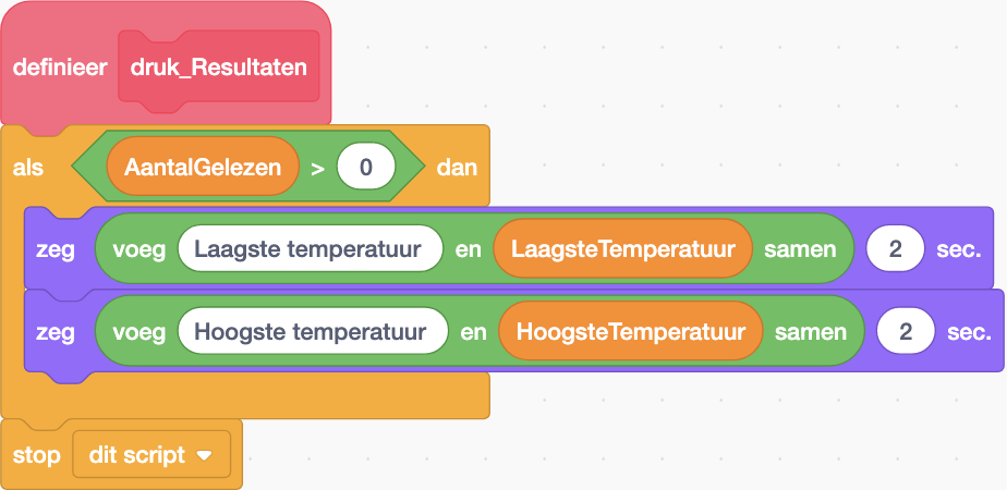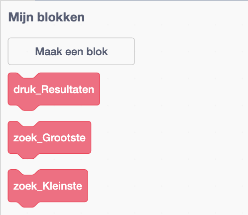 De instructies die in een bepaald blok moeten worden uitgevoerd worden toegevoegd aan het definieer-blok beschikbaar in deel C. Alle gedefinieerde variabelen zijn beschikbaar en kunnen ook in deze blokken worden gebruikt. De blokken zoek_Kleinste en zoek_Grootste worden dan als volgt opgemaakt: